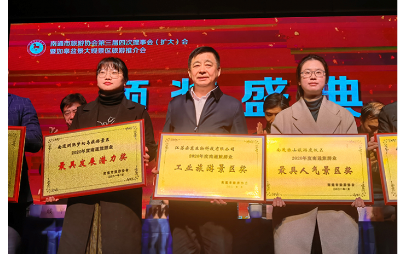 2021年3月2日,南通市旅游協會三屆四次會員大會在長壽之鄉——如皋召開。安惠生物科技園獲評2020年度南通旅游業“工業旅游景區獎”,安惠公司董事長陳惠榮獲2020年度南通旅游業“突出貢獻獎”,并當選南通市旅游協會副會長。